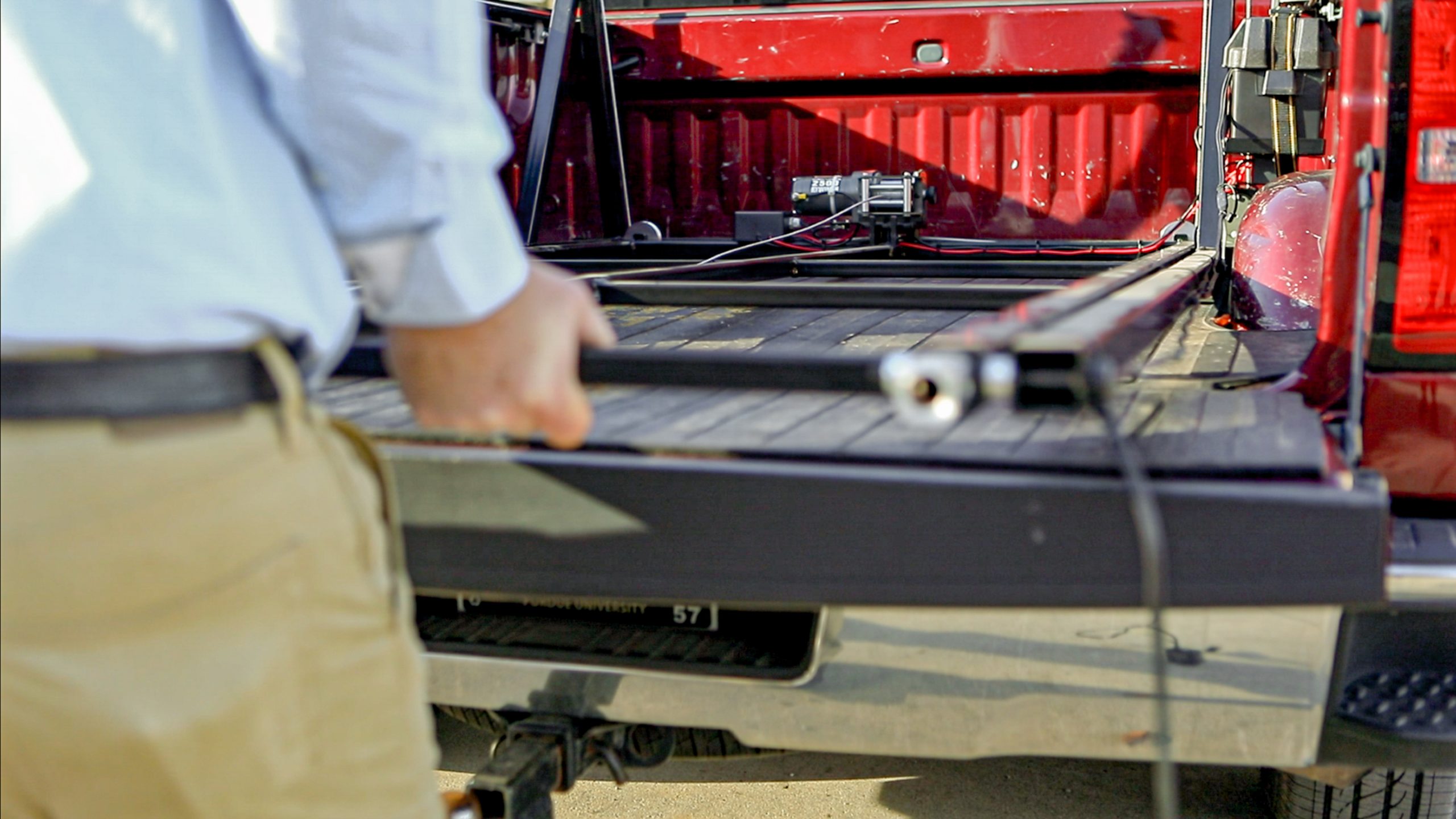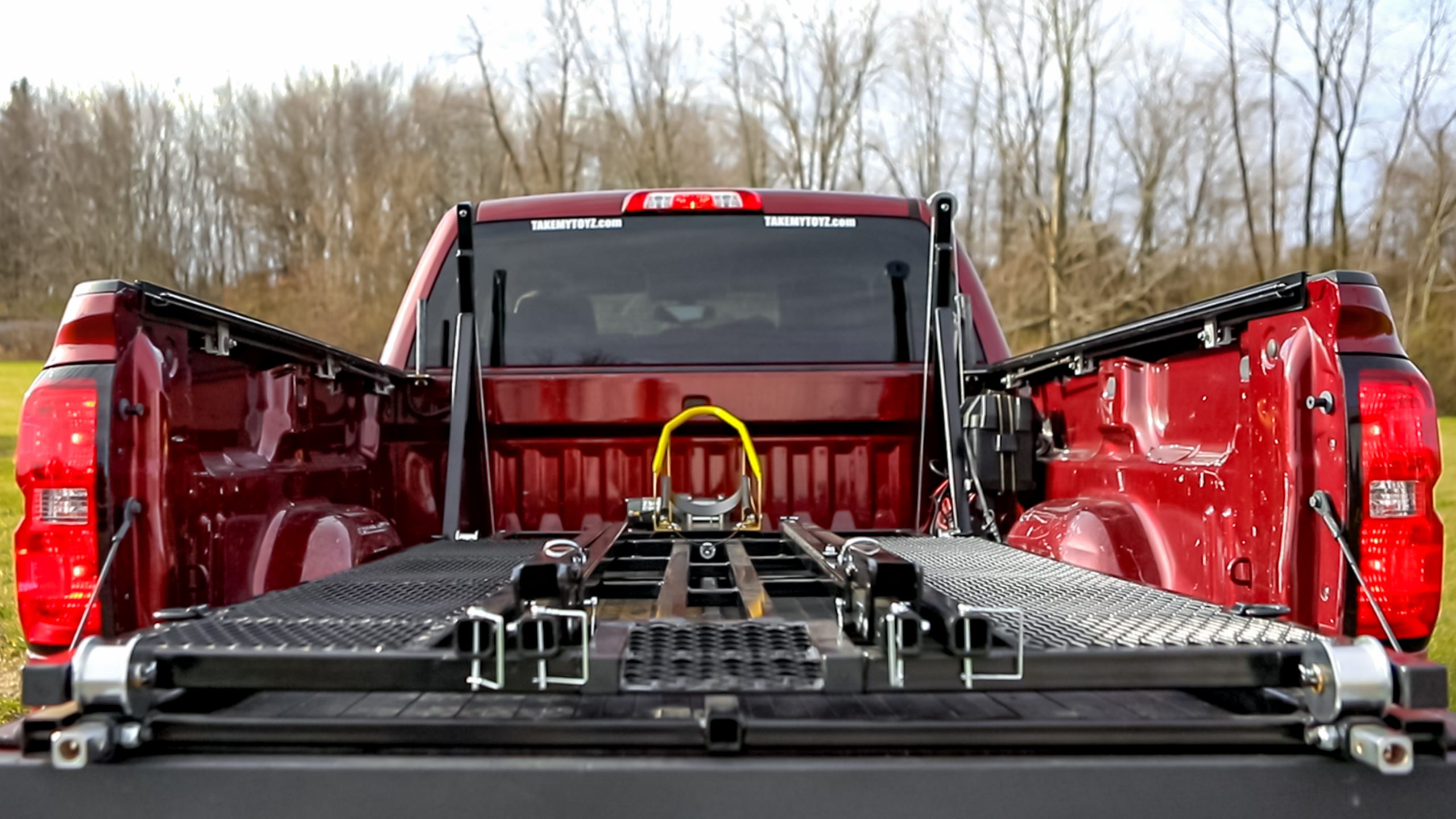 Designed to fit 5.5′, 6.5′, and 8′ full size pickup truck beds with the tailgate still attached. (optional on 8′ bed). The main frame of the Take-My-Toyz® is easily installed by sliding it between the wheel wells on top of a recommended rubber mat.